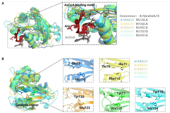 Three-dimensional models of Arabidopsis thaliana Nats. The AcCoA-binding motives (A) of Arabidopsis Nats are strongly conserved (shown in red with conserved residues highlighted in ribbon mode). AcetylCoA is represented in grey. The Nat catalytic sites (B) have distinct surface characterizations in shape, size, and electrostatic properties, which is consistent with their ability to acetylate distinct substrate pools. Catalytically important residues were either reported in [1,2] for AtNatE and AtNatF or estimated based on their human and yeast counterparts for AtNatA–C [3] and are represented in stick mode. The crystal structures of AtNAA50 (6YZZ, green) and AtNAA60 (6TGX, cyan) were downloaded from the Protein Data Bank (https://www.rcsb.org, accessed on the 9 November 2022), whereas the three-dimensional structures of the other Nats were generated with SwissModel (https://swissmodel.expasy.org, accessed on the 9 November 2022) based on their human or yeast counterparts using the templates 6c9m.2.B (AtNAA10, blue), 7stx.1.A (AtNAA20, yellow) and 7l1k.1.A (AtNAA30, orange).