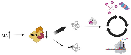 Hypothesis of phytohormone-regulated proteome destabilization via depletion of NatA in A. thaliana. In the presence of abscisic acid, NatA is depleted [20]. In consequence, less proteins are N-terminally acetylated. NatA substrates with free N-termini are recognized by up-to-date unknown E3 ubiquitin ligases, which target these proteins for degradation via the proteasome. Altogether, the depletion of NatA activity results in an increased overall protein turnover, as the degraded NatA substrates are replaced by newly synthesized proteins.