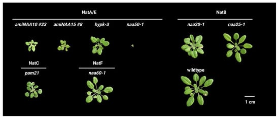 Phenotype of A. thaliana mutants impaired in different components of the NTA machinery. Mutants impaired in Nat machinery components (amiNAA10 #23, amiNAA15 #8, hypk-3 = SALK_080671, naa20-1 = SALK_027687, naa25-1 = GK-819A05, pam21 (photosyntheis affected mutant21 = SALK_119000, naa60-1 = SALK_016406C, naa70 = SALK_072318) were grown on soil for four weeks under short-day conditions, except for the naa50 mutant (SAIL_1210_A02) which was germinated on ½ MS medium and transferred to soil after four weeks of growth. Photographs were taken by the authors and represent phenotypes of mutants previously described in independent studies cited in the main body text.