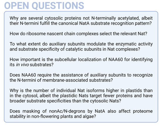 In plants, only AtNAA50 has been found in the nucleus so far. In analogy to HsNAA10, AtNAA50 has been speculated to moonlight as transcriptional regulator [44]. Currently, the subcellular localization of plant Nats and their potential functions in the nucleus are understudied.