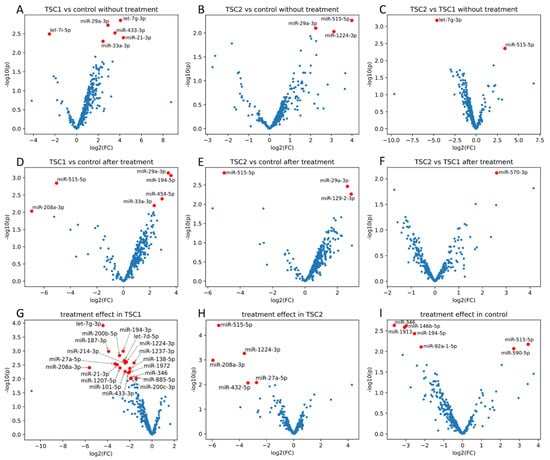 Differences in miRNA expression between TSC1 defect and control (A), TSC2 defect and control (B), and TSC1 and TSC2 defect (C), without rapamycin treatment and after rapamycin treatment (D, E, F, respectively). Effect of rapamycin treatment on miRnome in TSC1 (G), TSC2 (H) and control (I). All fold changes (FC) and p-values from limma (Supplementary Files 3–11). Red marksdenote miRNAs with p values <0.01.