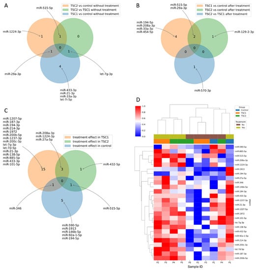 Overlap of differentially expressed miRNAs before (A) and after (B) rapamycin treatment. Overlap of treatment effects in TSC1 defect, TSC2 defect and control (C). Expression of miRNAs changed during rapamycin treatment in any of the groups (D).