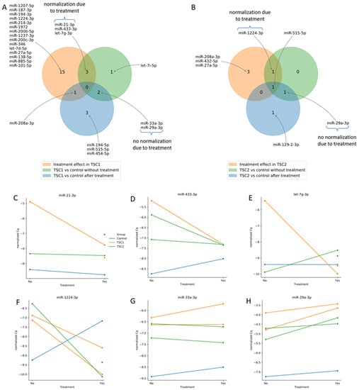 The effect of treatment on miRNA expression in the TSC1 and TSC2 groups is shown in Figure 3. From six miRNAs dysregulated before rapamycin treatment in TSC1, three normalized after treatment (miR-21-3p, miR-433-3p, let-7g-3p; Figure 3C–E) and the other two did not normalize after treatment (miR-33a-3p, miR-29a-3p; Figure 3G,H). Of the three miRNAs dysregulated before rapamycin incubation in the TSC2 group, miR-1224-3p normalized after treatment (Figure 3F) and miR-29a-3p did not (Figure 3H).