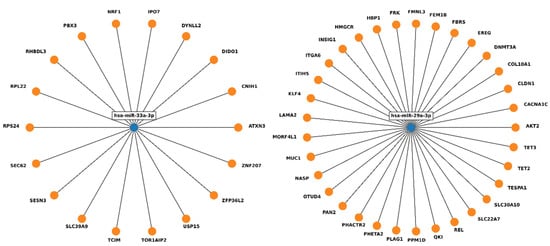 To evaluate the implications of the miRNAs which did not normalize after treatment, the experimentally validated targets from miRTarBase were analyzed using miRWalk software (http://mirwalk.umm.uni-heidelberg.de/, accessed on 21 October 2022). In total, 51 genes were found; however, none of them were targeted by both miR-33a-3p and miR-29a-3p (Figure 4, Supplementary File 12), and no Reactome or KEGG pathways involving the two miRNAs were identified (Supplementary Files 14 and 15). Subsequent analysis revealed putative targets (predictions from miRDB generated by MirTarget) for the selected miRNAs (Supplementary File 13).