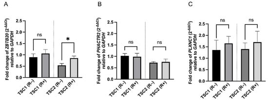 Effect of rapamycin treatment on ZBTB20 (A), PHACTR2 (B) and PLXNC1 (C) genes in TSC1 or TSC2 defected cells. Asterisks represent statistical significance from an unpaired Student’s t-test (* p < 0.05), ns represents no statistical significance. Error bars represent SEM values.
