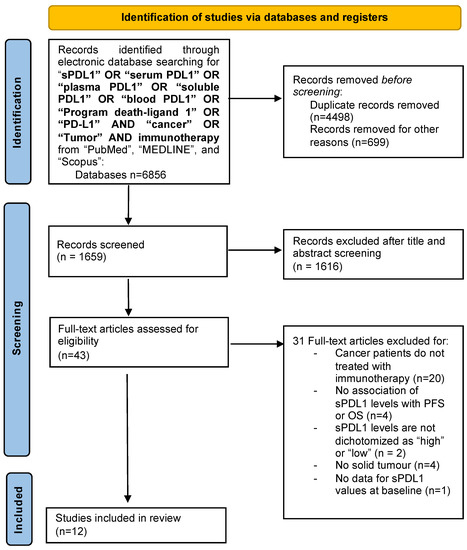 The study selection process is summarized in Figure 1. In total, 6856 papers were found in the literature search, and after excluding duplicates, abstracts, review articles, letters, mouse studies and chapters of books, 1659 articles were screened. Of these, 1616 manuscripts were further excluded after the title and abstract screening. After full-text screening, 31 full-text articles were excluded for the following reasons: treatment other than immunotherapy (n = 20); no investigation between sPD-L1 levels and PFS or OS (n = 4); no dichotomy of sPD-L1 levels as “high” or “low” (n = 2); no solid tumor (n = 4); no data for sPD-L1 values at baseline (n = 1). Finally, 12 studies involving several tumors (such as mesothelioma [18], melanoma [19,20], NSCLC [20,21,22,23,24,25,26,27], RCC [20,28]) and a total of 1076 patients met the inclusion criteria and were considered for the review. The details of the studies that fulfilled the inclusion criteria are presented in Table 1. The outcome was sub-categorized according to sPD-L1 values, under or above the threshold reported in the investigated studies (cut-off value).