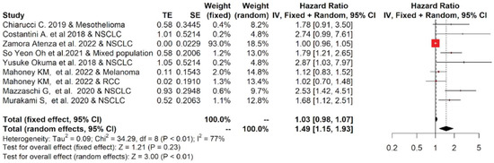Nine studies reporting the OS of 880 cases were included in the meta-analysis. Among the studies reporting the OS, the one-year OS average(range) was 62.2 % (55.6–69.7%) and 34.9% (14–55%) for cancer patients with low and high values of sPD-L1, respectively, while the two-year OS average(range) was 38.0% (19.6–54%) and 16.8% (0–30%), respectively (Table S1). Moreover, the OS data were pooled, and the results are shown in Figure 2. The forest plot reported that a high concentration of sPD-L1 in the blood of cancer patients treated with immunotherapy at baseline was associated with reduced OS. The median (range) of the overall pooled HRs comparing the high- versus low-sPD-L1 values group based on the random-effects model was 1.49 (95%CI: 1.15, 1.93, p < 0.01, I2 = 77%).