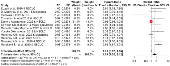Overall pooled HRs comparing the high- versus the low-PD-L1 values group for OS in patients with solid cancer treated with immunotherapy. The column study indicates the reference (from which we extracted or calculated the HR and 95% CI) and the investigated tumor type [18,20,22,23,24,25,26,27,28].