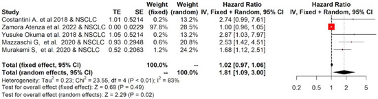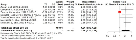 The twelve studies included in the meta-analysis mainly considered three different tumor types treated with immunotherapy: NSCLC, RCC and melanoma. Therefore, a subgroup analysis was performed for each tumor. The subgroup meta-analysis, which pooled data for OS from five studies, including 542 patients affected by NSCLC, indicated that a higher concentration of sPD-L1 in the blood of these patients was significantly associated with worse survival, with an HR = 1.81 (95%CI: 1.09–3.00, p = 0.02, I2 = 83%; Figure 4). Similar results were obtained for PFS: seven studies that included 616 patients revealed that high levels of sPD-L1 correlated with unfavorable survival in the NSCLC group with an HR = 2.18 (95%CI: 1.27–3.76, p < 0.01, I2 = 88%, Figure 5). These data were not confirmed for RCC and melanoma patients. In particular, no statistically significant association between sPD-L1 levels and PFS was obtained in the RCC group with an HR = 0.59 (0.13–2.66, p = 0.49, I2 = 83%, Figure S2) and in the melanoma patients with an HR = 1.16 (95% CI:0.65–2.08, p = 0.62, I2 = 52%, Figure S3). However, the subgroup meta-analysis conducted on these two tumor types did not have the statistical power to consider whether or not sPDL1 was a prognostic factor. This is due to the limited number of studies included: two for RCC and two for melanoma. Only one study was conducted on mesothelioma patients; therefore, it was not possible to conduct subgroup analyses.