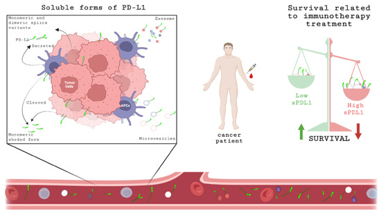 Schematic representation of sPD-L1 expression. Soluble forms of PD-L1 can be released by tumor cells or APCs in different ways: cleaved, secreted monomeric or dimeric splice variants or associated with microvesicles or exosomes. These soluble forms can be detected in serum/plasma. At baseline, before starting immunotherapy treatment, the concentration of sPD-L1 in blood of cancer patient could be a prognostic biomarker related to survival; high levels of sPD-L1 are associated with unfavorable OS and PFS. Created with BioRender.com, accessed on 20 July 2022.