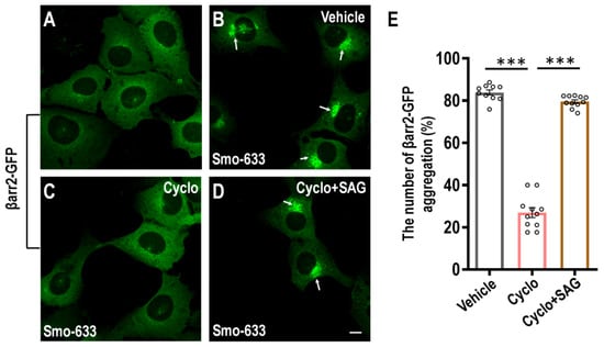 Novel Smo inhibitors were identified in U2OS cells. (A–D) The U2OS cells stably overexpressing βarr2-GFP and Smo-633 were treated with DMSO vehicle (A), 1 μM cyclopamine (Cyclo) (B), 100 nM TT22 (C), or 100 nM TT22 and 1 μM SAG (D) for 24 h at 37 °C. The arrows show the intravesicular aggregation of βarr2-GFP. (E) The percentage of the number of βarr2-GFP aggregation was quantitated. The scale bar is 20 µm. All data are means ± SEM (one-way ANOVA). *** p < 0.001.