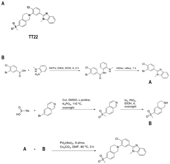 The structure and synthetic route of compound TT22. (A) Structure of compound TT22. (B) Synthetic route of compound TT22.