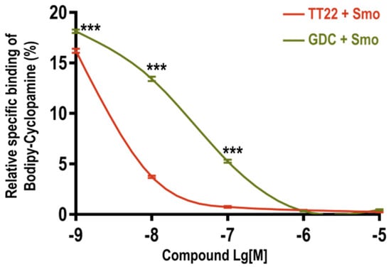 TT22 competes with Bodipy-cyclopamine to bind with Smo. Competitive binding of Bodipy-cyclopamine to Smo with different concentrations (10−9–10−5 M) of Smo antagonists: TT22, GDC-0449 (GDC) in HEK293 cells transiently transfected with human wild-type Smo. The binding of Bodipy-cyclopamine (green) was detected by flow cytometry. All data are means ± SEM (two-way ANOVA). *** p < 0.001.