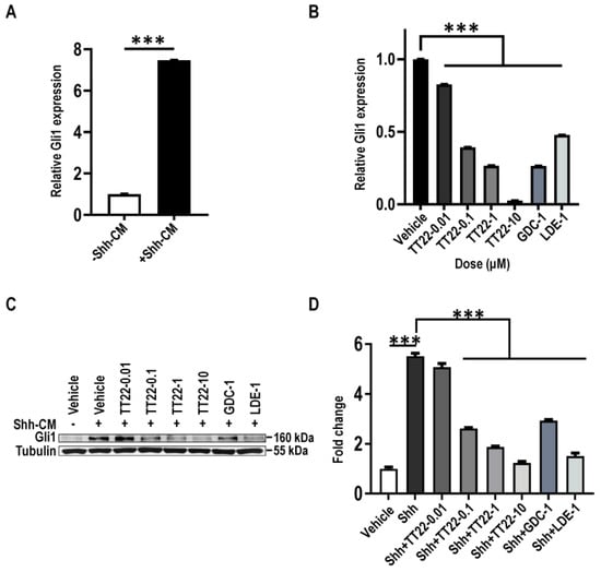 The expression of Gli1 stimulated with Shh-CM was suppressed by TT22. (A) Serum-starved NIH3T3 cells were treated with Shh-CM for 24 h, then analyzed for mRNA levels of Gli1. (B,C) Serum-starved NIH3T3 cells were induced by Shh-CM with DMSO (vehicle), with an indicated concentration of TT22, 1 μM LDE-225 (LDE-1) or 1 μM GDC-0449 (GDC-1) for 24 h. Cells were analyzed for mRNA levels (B) and the protein levels (C) of Gli1. (D) Quantitation of Gli1 protein levels normalized to Tubulin loading control measured the dose-dependent inhibition of the Hh pathway activity by TT22 upon Shh stimulation. All data are means ± SEM (Student’s t-test and one-way ANOVA). *** p < 0.001.