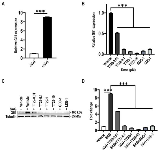 The expression of Gli1 stimulated with SAG was suppressed by TT22. (A) Serum-starved NIH3T3 cells were treated with 100 nM SAG for 24 h, then analyzed for mRNA levels of Gli1. (B,C) Serum-starved NIH3T3 cells were induced by 10−7 M (100 nM) SAG with DMSO (vehicle), with the indicated concentration of TT22, 1 μM LDE-225 (LDE-1) or 1 μM GDC-0449 (GDC-1) for 24 h. Cells were analyzed for mRNA levels (B) and the protein levels (C) of Gli1. (D) Quantitation of Gli1 protein levels normalized to Tubulin loading control measured the dose-dependent inhibition of the Hh pathway activity by TT22 upon SAG stimulation. All data are means ± SEM (Student’s t-test and one-way ANOVA). *** p < 0.001.