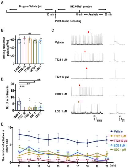 TT22 attenuates the seizure-like activity. (A) The cultured hippocampus neurons (n = 7–10) were treated with DMSO, TT22, GDC-0449, and LDE-225 for 30 min at 37 °C. Then, neurons were transferred to the patch clamp platform and perfused with high K+/0Mg2+ extracellular solution without drugs to induce the seizure-like activity until the cells were completely incubated. After that the cells were recorded by patch clamp for 30 min. The recorded data between the 10th and 20th minute were taken for analysis. (B) Measurement of resting membrane potential of neurons. After the incubation of indicated drugs for 30 min, neurons were transferred to a standard extracellular solution for whole-cell recordings treated with indicated compounds. Resting membrane potential (Vm) was determined when I = 0. (C) Representative traces show the activity of neurons under the indicated treatment and the expanded view of a single burst (arrow). (D) The firing frequency of neurons were quantitated. (E) The number of seizure-like activities between the 10th and 20th minute was quantitated. All data are means ± SEM (one-way ANOVA and two-way ANOVA). * p < 0.05 ** p < 0.01 *** p < 0.001.