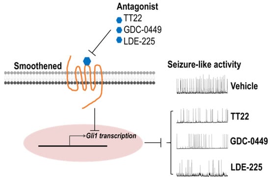 Scheme of the inhibition of Smoothened antagonists on seizure-like activity. Antagonists TT22, GDC-0449, and LDE-225 can bind with a Smoothened receptor, repress its activity, and then inhibit the expression of a downstream Gli1 transcription factor, thus suppressing the abnormal seizure-like activity in hippocampal neurons.