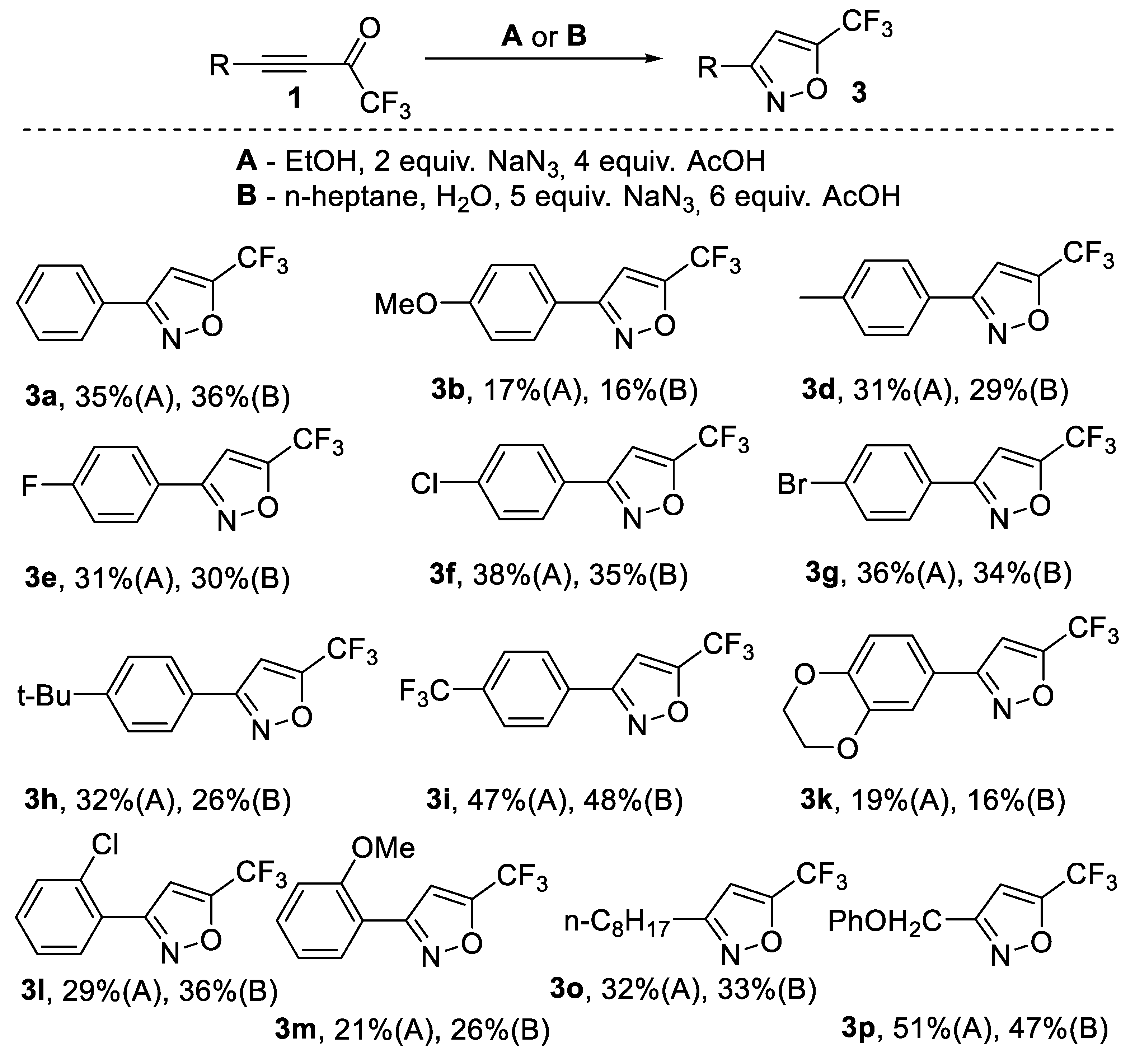 - Hamper, B.C.; Leschinsky, K.L. Reaction of benzohydroximinoyl chlorides and β-(trifluoromethyl)-acetylenic esters: Synthesis of regioisomeric (trifluoromethyl)-isoxazolecarboxylate esters and oxime addition products. J. Heterocycl. Chem. 2009, 40, 575–583. [Google Scholar] [CrossRef]