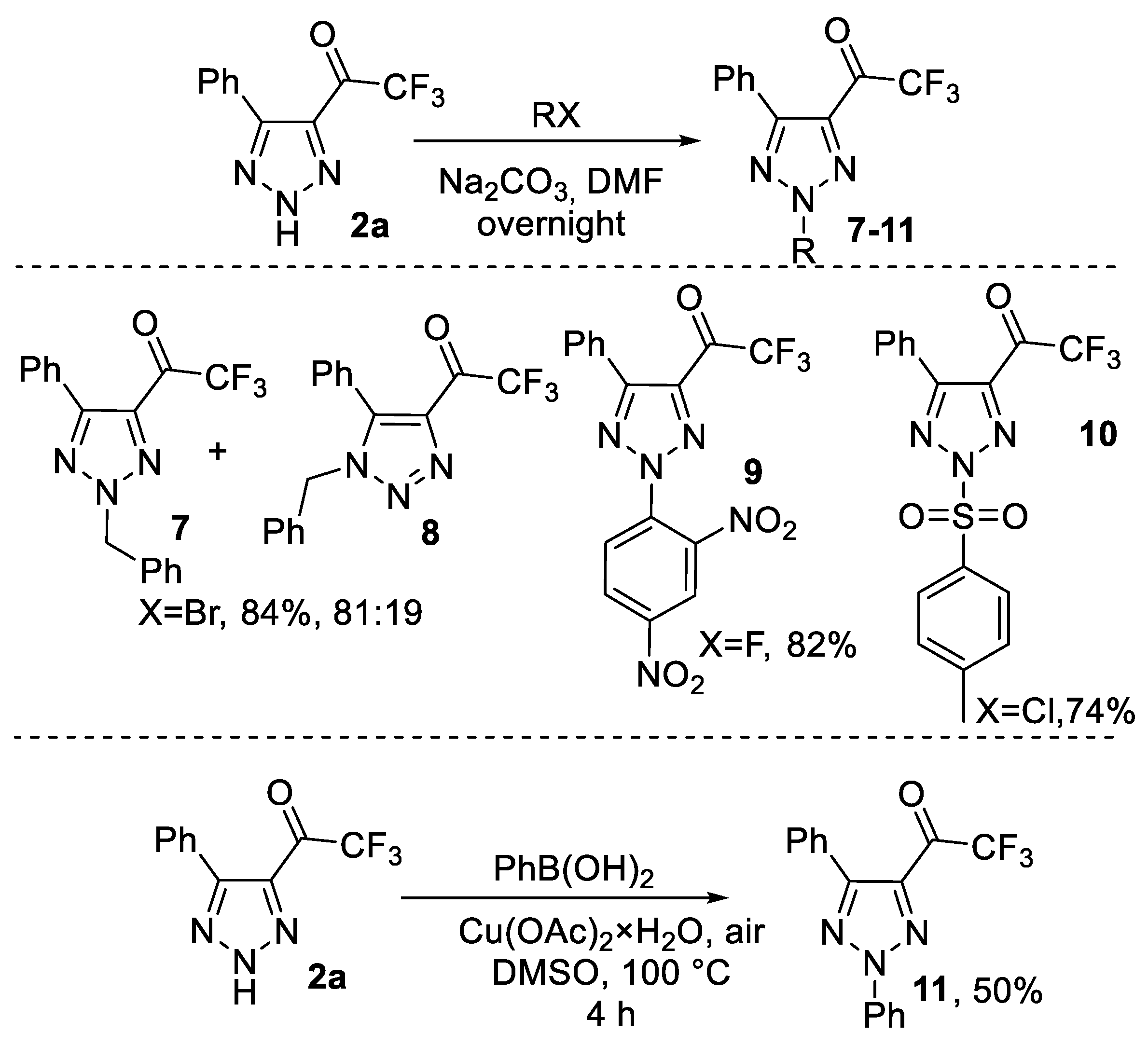 - Muzalevskiy, V.M.; Mamedzade, M.N.; Chertkov, V.A.; Bakulev, V.A.; Nenajdenko, V.G. Reaction of CF3 -ynones with azides. An efficient regioselective and metal-free route to 4-trifluoroacetyl-1,2,3-triazoles. Mendeleev Commun. 2018, 28, 17–19. [Google Scholar] [CrossRef]
