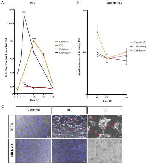 The analysis of a single-time exposure of 1.5 h revealed significantly increased H2O2 levels in MCs with a peak at 6 h after exposure (+11.21-fold ± 0.61, p < 0.0001) (Figure 1A). In addition, a significantly enhanced caspase 3/7 activity with a peak at 12 h (+7.182-fold ± 0.3453, p < 0.0001) after exposure was detected (Figure 1A). In accordance with the prior two observed effects, the metabolic activity, determined via MTS assay, was slightly increased after 6 h (+21%, p < 0.001) and did not decrease before 24 h (−40%, p < 0.0001), further pointing to the highly energy-consuming death process, apoptosis, as the primary cell death pathway (Figure 1A). This hypothesis was again corroborated by the decreased cell density of BL-exposed MCs 24 h after exposure (−0.58-fold ± 0.04), determined by crystal violet staining (Figure 1A). During morphological analysis, condensed nuclei, apoptotic blebs, and cell shrinkage were observed in MCs (Figure 1C), again indicating apoptosis as the primary cell death pathway for MCs. In contrast to BL exposure of the primary MCs, BL exposure of MIO-M1 cells caused less caspase 3/7 induction after 6 h of cultivation (281% less than in MCs) (Figure 1B). The observed induction in caspase 3/7 activity (+50%) decreased further toward control levels after 24 h (Figure 1B). Likewise, there was no strong decrease in cell viability or density 24 h after BL exposure (Figure 1B). Morphologically, MIO-M1 cells did not show apoptotic blebs (Figure 1C) and also demonstrated almost no cell shrinkage or cell death 24 h after BL exposure (Figure 1C). Taken together, the human MIO-M1 cell line was less sensitive to BL compared to primary MCs.