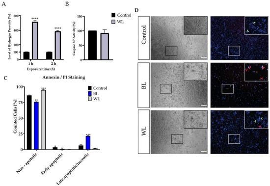 Over the last few decades, more and more time has been spent indoors and in front of screens, thus increasing artificial WL exposure. LEDs contain a high amount of harmful BL, but also protective wavelengths such as RL [40,41,42]. To investigate whether the proportion of BL in a single WL exposure is enough to harm MCs, and whether the proportion of RL is enough to protect the MCs, MCs were exposed to WL with an intensity of 30 mW/cm2 (Figure 2). In parallel, MCs were exposed to BL with the same intensity to reveal its toxic effect (Figure 2). BL-enriched WL was sufficient to induce significantly oxidative stress levels in MCs (Figure 2A). However, a single WL exposure did not induce caspase 3/7 activity (Figure 2B). To verify that a single WL exposure did not induce apoptosis, PI (propidium iodide, red) and annexin V/FITC (green) staining was conducted (Figure 2C,D). Annexin V/DAPI staining that does not colocalize with PI represents early apoptotic cells, whereas annexin V/PI colocalization represents late apoptotic or necrotic cells. Exposure to BL resulted in increased cell death, as indicated by higher annexin V/PI staining, in contrast to WL exposure (Figure 2C,D), where no difference to the controls was observable. This finding indicates that a single WL exposure did not lead to cell death in MCs, whereas BL exposure did. Thus, BL constitutes the harmful part of WL exposure.