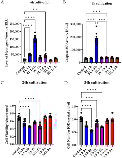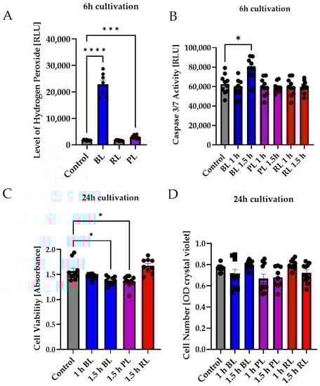 In the next step, the effect of PL and RL exposure on human MIO-M1 cells was investigated to determine differences between primary cells and the human cell line. Again, BL induced oxidative stress in MIO-M1 cells (1.5 h exposure, 6 h cultivation), whereas PL exposure only slightly induced oxidative stress levels, and RL exposure did not alter stress levels at all (Figure 4A). PL exposure (1 and 1.5 h) did not affect caspase 3/7 activity in MIO-M1 cells (Figure 4B), while BL only slightly induced caspase 3/7 activity (+27%, p < 0.05, Figure 4B). RL did not alter caspase 3/7 activity (Figure 4B). The cell viability of MIO-M1 cells only slightly decreased following 1.5 h BL or PL exposure (−16% and −15%, respectively, p < 0.01; Figure 4C). In contrast, RL exposure slightly (but not significantly) increased viability. BL, PL, and RL exposure had no effect on MIO-M1 cell numbers 24 h after exposure (Figure 4D).