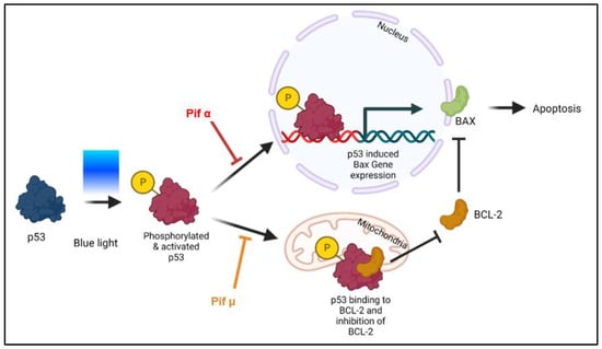 Blue light-induced apoptosis can be prevented through p53 inhibition (model). Although direct effects have not yet been shown, it is likely that following blue light (BL) exposure, the tumor suppressor protein p53 is modified (e.g., phosphorylated) and, thus, accumulates in an activated form in the cell, resulting in expression of its pro-apoptotic target genes such as Bax. Based on current knowledge, pifithrin α (Pif α), a cell-permeable transcriptional p53 inhibitor, inhibits p53-dependent gene transcription. Therefore, Pif α could prevent Bax expression after BL exposure. It is further known that pifithrin µ (Pif µ) prevents p53 function on the mitochondrial side without affecting p53 transcriptional activities. Activated and accumulated p53 normally binds to BAX inhibitor BCL-2, thus resulting in an increase in free BAX and induced apoptosis. Therefore, Pif µ treatment could block the binding of p53 to BCL-2, resulting in an increase in free BCL-2 and, therefore, less free pro-apoptotic BAX. Pif µ could, therefore, also inhibit BL-induced apoptosis.