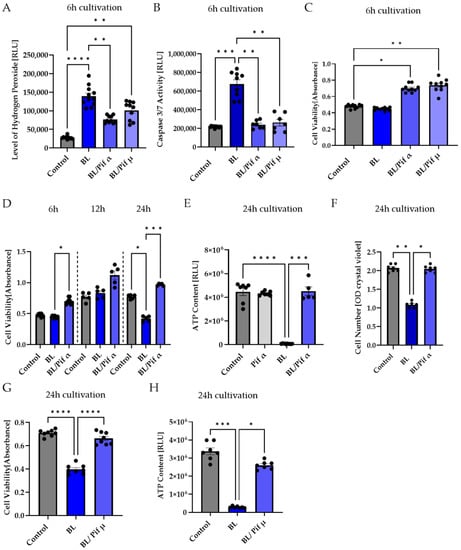 As MCs exhibited a pronounced sensitivity to BL, it is crucial to investigate the consequences of the high H2O2 levels on these cells. To this end, caspase-mediated apoptosis, metabolic activity, cell viability, and cell density were measured in both primary MCs and the human MIO-M1 cell line over 24 h (Figure 1A,B).
