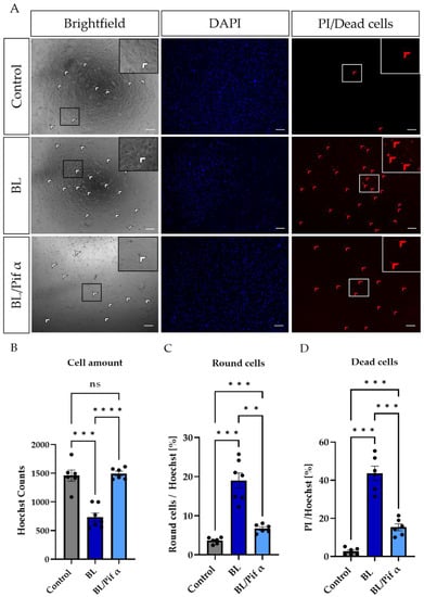 Morphologically, more rounded cells (Figure 8) were observed in BL-exposed MCs (Figure 7A,C), further underlining apoptosis as the primary cell death pathway. Treatment with pifithrin α significantly reduced the number of rounded cells (Figure 7A,C) and increased the general number of MCs (as indicated by Hoechst staining; Figure 7A,B). In this context, the number of dead cells (PI-positive cells) was also significantly reduced following treatment with pifithrin α right after BL exposure (Figure 7A,D).