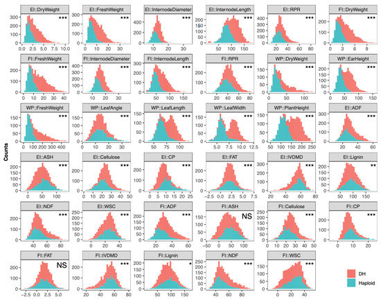 Phenotypic value distributions of the DH and haploid populations for each of the 35 traits. For each trait, histograms of the two populations were plotted independently and based on all phenotypic values across four environments. The t-test was applied to test the mean difference between the two populations for each trait, for which *** = significant at p < 0.001, ** = significant at p < 0.01, * = significant at p < 0.05, and NS = not significant.