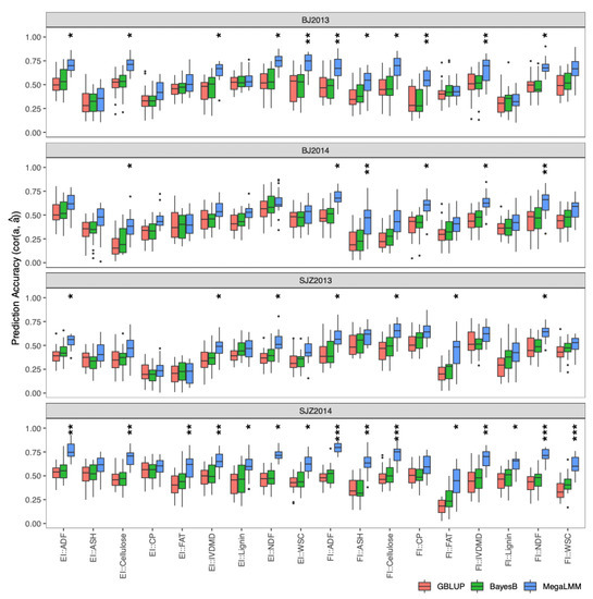 To simulate the case in which a breeding program can afford only one location, we performed genomic prediction in each individual environment, leaving out the possible information available from other environments. We compared univariate models taking each trait individually (fitting with GBLUP and BayesB models) to multi-trait models that considered all traits at once (fitting with MegaLMM method). For multi-trait genomic prediction, we considered the “trait-assisted” scenario where the key “focal” traits were measured for a subset of DH lines, but some “secondary” traits were measured for all DH lines. We considered stalk quality traits as focal traits and agronomic traits as secondary traits, because all the agronomic traits in our study can be directly measured in the field, while stalk quality traits require complex chemical experiments in the laboratory or calibration of near-infrared spectroscopy (NIRS) models. We applied CV2-style cross-validation [12] to evaluate model accuracy: all agronomic traits of all DH lines and stalk quality traits of a subset of DH lines were used for model training, and stalk quality traits of the remaining DH lines were predicted and used for model validation. Since the focal and secondary traits were measured on the same plots and therefore shared the same nongenetic sources of variation, the prediction accuracy of each model was estimated as the genetic correlation (cor (a, â)) between observed and predicted genotypic values multiplied by square root of estimated heritability [13], instead of the more traditional Pearson’s correlation (cor(y, â)/sqrt(h2)). Estimated prediction accuracies of multi-trait models fit with MegaLMM were significantly higher than both univariates model for 11 (BJ2013), 6 (BJ2014), 7 (SJZ2013), and 15 (SJZ2014) stalk quality traits in the four environments (Figure 3) based on the corrected resampled t-test [14]. Between the two univariate models, BayesB showed no significant difference in prediction accuracy compared to GBLUP.
