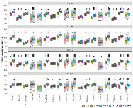 We compared prediction accuracies of different multi-trait models using the prediction accuracy from GBLUP in the single-environment model (D-D) as a baseline. Here, we estimated prediction accuracy as cor (y, â), because the phenotypes of stalk quality traits of the same genotypes were collected from individuals grown in different environments [13]. We found that there was no significant difference between the D-UN and D-D models for all traits in all environments (Figure 4), and almost all other multi-trait models outperformed their counterpart single-environment models (i.e., D-D) in at least three environments for all traits, except for crude fat (EI::FAT and FI::FAT) and lignin (EI::lignin).