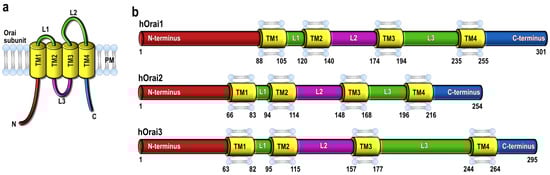 (a) Predicted topology of Orai proteins. (b) A schematic representation of the three members of the Orai family with their structural domains. Abbreviations: L, loop; TM, transmembrane domain.