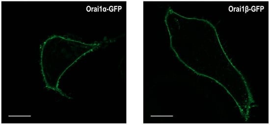 Analysis of Orai1α and Orai1β subcellular locations has revealed that, as expected, both Orai1 variants are predominantly localized in the plasma membrane []. Figure 3 shows that Orai1α-GFP and Orai1β-GFP expressed in Orai1-KO HEK-293 cells are exclusively located at the plasma membrane; therefore, the truncation of N-terminal 63 amino acids in Orai1β does not affect its plasma membrane location in resting cells. Furthermore, Fukushima and coworkers demonstrated that Ca2+ store depletion using the SERCA inhibitor thapsigargin or the physiological agonist carbachol resulted in the accumulation of Orai1α and Orai1β into puncta with similar efficiency, thus indicating that Orai1α and Orai1β exhibit a similar subcellular location []. Nevertheless, although no differences have been found in the cellular distribution of both Orai1 variants, the mobility of Orai1α and Orai1β in the plasma membrane significantly differs. As analyzed by rates of fluorescence recovery after photobleaching (FRAP), either expressed singly or together, the half-time of Orai1β recovery follows a normal distribution while that for Orai1α exhibits a bimodal distribution, the first one with a half-time similar to that of Orai1β followed by a second, predominant, population with a slower rate of recovery. The nature of the two populations of Orai1α rates of recovery remains uncertain. The observation that Orai1β exhibits the same mobility profile either expressed alone or co-expressed with Orai1α, which is different from the Orai1α mobility profile, suggests that Orai1α and Orai1β do not form heteromeric channels; however, further studies are required to characterize the two Orai1α populations and whether the minor, faster, population of Orai1α might heteromerize with Orai1β under certain conditions, as co-expression of both Orai1 forms slows down their rates of recovery [].