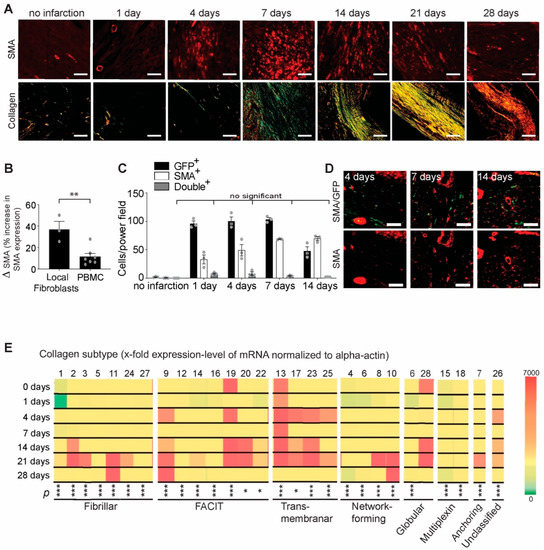 Characterization the origin and collagen subtype expression of myofibroblasts after myocardial infarction. (A) Time course of alpha smooth muscle actin staining (red, upper panel; scale bar, 50 µm) and Sirius red staining (lower panel, scale bar 200 µm) after myocardial infarction. (B) Percentage of alpha smooth muscle actin-positive (myofibroblasts) cells differentiated from cardiac fibroblasts and blood mononuclear cells (PBMC). As determined by α-SMA staining, local cardiac fibroblasts have an increased potential to differentiate towards myofibroblasts under TGF-ß1 stimulation and under hypoxic conditions compared with blood cells (** p < 0.01, t-test, n = 3–7 mice). (C) GFP-positive bone marrow reconstitution of lethally irradiated mice reveals that local differentiated myofibroblasts constitute most of the cells responsible for extracellular matrix synthesis; GFP/SMA double-positive cells (gray columns) are not significant compared with the control (two-way ANOVA followed by Tukey’s post hoc test, n = 3 mice per group). (D) Selected representative images of GFP/SMA double-positive cells (upper panel, yellow) and α-SMA cells (lower panel, red) at the time points characteristic of increased presence of myofibroblasts (scale bar, 50 µm). (E) mRNA expression levels of different collagen subtypes at different time points after myocardial infarction (normalized to α-actin) (* p < 0.05, *** p < 0.001, one-way ANOVA for each collagen subtype followed by Tukey’s post hoc test, n = 3 mice per group).