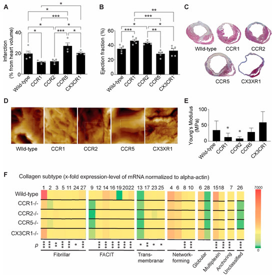 Furthermore, we demonstrated in our previous studies that the composition of the scar can be significantly modified by immune cells [6,25,26]. Using different knockout models, we showed that the collagen content can vary, despite the increased preservation of heart function or decreased infarction size. CCR2−/− mice, which exhibit reduced inflammatory monocyte recruitment [28,29], showed preserved heart function and reduced infarction size after the induction of myocardial infarction. However, CCR1−/− and CXCR4−/−, which exhibit reduced neutrophil recruitment [25,26], demonstrated an increased content of collagen in the infarcted areas, despite preserved heart function and decreased infarction size, suggesting a direct effect of immune cells on the collagen synthesis of myofibroblasts. In the current study, we investigated the collagen subtypes in different knockout models with a varying pattern of inflammatory response. As previously established, we observed a preserved ejection fraction and decreased infarction size in the mice presenting with reduced neutrophil infiltration (CCR1−/−) and reduced inflammatory monocyte infiltration (CCR2−/−), as well as depreciated ejection fraction and increased infarction size in mice with reduced reparatory monocyte infiltration (CX3CR1−/−) or T-regulatory cell infiltration (CCR5−/−) compared with wild-type mice undergoing a myocardial infarction procedure. Our results are also consistent with reduced stiffness as a requirement for a improved functional outcome after myocardial infarction (CCR1−/− and CCR2−/−). However, the investigation of different collagen subtypes in the mature scar in these mice resulted in inconclusive results. Despite the differences between the groups, none of the collagen subtypes was directly associated with a specific group of mice. Thus, we can speculate that no singular collagen subtype can significantly influence the resulting mature scar, although the interconnection between different types of collagen subtypes should be considered and further investigated. Intensive research will be necessary to identify the role of each collagen subtype and the type of interconnection with other collagen subtypes to create such a simulation and to fully understand how the extracellular matrix is formed after myocardial infarction.