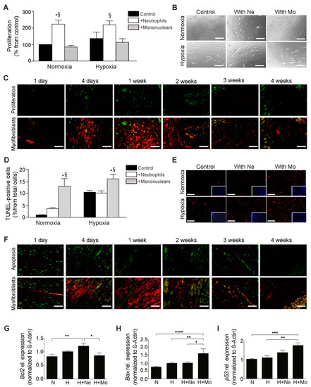 The influence of immune cells on apoptosis and proliferation of myofibroblasts. (A) Proliferation of myofibroblasts under normoxic/hypoxic conditions in the presence of neutrophils (Ne) and mononuclear cells (Mo) (* p < 0.05 vs. control, § p < 0.05 vs. mononuclear cells, one-way ANOVA followed by Tukey’s post hoc test comparing the groups, n = 5–6; the experimental data for one run are presented; the experiment was repeated four times). (B) Representative images of proliferating myofibroblasts in the presence of neutrophils and mononuclear cells (phase light; scale bar, 100 µm). (C) Representative images of proliferation (Ki67 in bright green, upper panel) of myofibroblasts (lower panel, Ki67 in bright green; alpha-actin in red; scale bar, 50 µm). (D) Apoptosis of myofibroblasts under normoxic/hypoxic conditions in the presence of neutrophils and mononuclear cells (* p < 0.05 vs. control, § p < 0.05 vs. neutrophils, one-way ANOVA followed by Tukey’s post hoc test comparing the groups, n = 7; the experimental data for one run are presented, the experiment was repeated three times). (E) Representative images of apoptotic myofibroblasts in the presence of neutrophils and mononuclear cells (apoptotic cells in red; scale bar, 100 µm; DAPI blue counterstaining in inserts showing the similar distribution of the cells in the cultures; a correction of the brightness/contrast was applied equally to all images in the power point to improve visibility for the reader). (F) Representative images of apoptotic cells (TUNEL in bright green, upper panel) of myofibroblasts (lower panel, TUNEL in bright green; alpha-actin in red; scale bar, 50 µm). (G) mRNA expression of Bcl2 as a survival and antiapoptotic marker in myofibroblasts (* p < 0.05, ** p < 0.01, one-way ANOVA followed by Tukey’s post hoc test comparing the groups, n = 9; three samples from three runs in triplicate) under normoxia (N), hypoxia (H) in coculture with neutrophils (Ne) or mononuclear cells (Mo). (H) mRNA expression of Bax as ab apoptotic marker in myofibroblasts (* p < 0.05, ** p < 0.01, **** p < 0.0001, one-way ANOVA followed by Tukey’s post hoc test comparing the groups, n = 9; three samples from three runs in triplicate). (I) mRNA expression of p53 as an apoptotic marker in myofibroblasts (** p < 0.01, *** p < 0.001, one-way ANOVA followed by Tukey’s post hoc test comparing the groups, n = 9).
