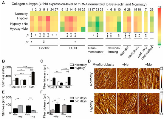 Assessment of mRNA expression of extracellular matrix proteins and biomechanics in mice four weeks after myocardial infarction. (A) qRT-PCR was performed for a semi-quantitative assessment of collagen subtypes in the absence/presence of different immune cells. Isolated myofibroblast were cultured under normoxic and hypoxic conditions and in coculture with neutrophils (+Ne) or mononuclear cells (+Mo). A heat map representing the level of mRNA expression was created in PowerPoint; significant values after ANOVA analysis of each protein are shown (* p < 0.05; ** p < 0.01; *** p < 0.001, one-way ANOVA followed by Tukey’s post hoc test, n = 3 mice). Significant differences between coincubation with mononuclear cells and neutrophils are shown separately (* p’ < 0.05; ** p’ < 0.01, one-way ANOVA followed by Tukey’s post hoc test, n = 3). (B) Myofibroblast stiffness in the absence and presence of neutrophil and mononuclear fractions, respectively (* p < 0.05, *** p < 0.001, one-way ANOVA followed by Tukey’s post hoc test, n = 3 mice). (C) Fiber thickness in myofibroblasts in the absence and presence of neutrophil and mononuclear fractions, respectively (** p < 0.01, *** p < 0.001, one-way ANOVA followed by Tukey’s post hoc test, n = 3). (D) Representative AFM images of myofibroblasts coincubated with immune cells under normoxia and hypoxia. (E) Myofibroblast stiffness after successive incubation steps with neutrophil followed by mononuclear fractions and with mononuclear followed by neutrophil fractions (*** p < 0.001, one-way ANOVA followed by Tukey’s post hoc test, n = 3 mice). (F) Fiber thickness in myofibroblasts after successive incubation steps with neutrophil followed by mononuclear fractions and with mononuclear followed by neutrophil fractions (** p < 0.01, one-way ANOVA followed by Tukey’s post hoc test, n = 3 mice).