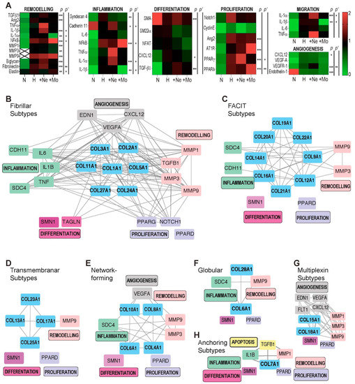 The modulation of gene expression by immune cells. (A) qRT-PCR was performed for a semi-quantitative assessment of collagen subtypes in the absence/presence of different immune cells. Isolated myofibroblasts were cultured under normoxic (N) and hypoxic conditions (H) and in coculture with neutrophils (+Ne) or mononuclear cells (+Mo). A heat map representing the level of mRNA expression was created in PowerPoint; significant values after ANOVA analysis of each protein are shown (* p < 0.05; ** p < 0.005; *** p < 0.0005, one-way ANOVA followed by Tukey’s post hoc test, n = 3; the experimental data for one run are presented; the experiment was repeated five times). Significantly differences between coincubation with mononuclear cells and neutrophils are shown separately (* p’ < 0.05; ** p’ <0.01, one-way ANOVA followed by Tukey’s post hoc test, n = 3; the experimental data for one run are presented; the experiment was repeated five times). (B–H) Interactions between signaling pathways and collagen subtypes identified in the gene–protein interaction analysis.