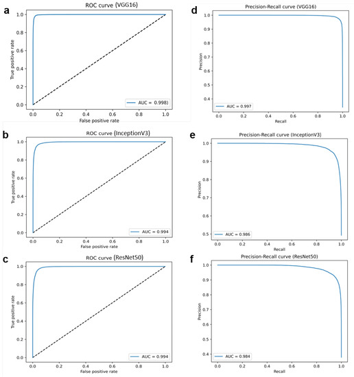 Results of Receiver Operating Curves (ROC) and AUC for VGG16 (a), InceptionV3 (b), and ResNet50 (c). Results of Precision–Recall curve (PRC) and AUC for VGG16 (d), InceptionV3 (e), and ResNet50 (f).