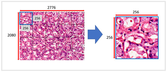 A random example of the original H&E image (2776 × 2080 pixels) and one patch sized to 256 × 256 pixels.