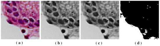 Example image patch filtering process. (a) An original patch (256 × 256 pixels); (b) patch after grayscale transformation; (c) smoothing filter for noise correction; (d) gray-scale patch is binarized from the 0–255 spectrum to a 0–1 spectrum.