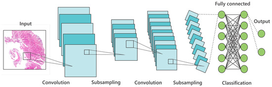 The CNN was implemented as a multilayer architecture based on artificial neural networks (ARNs) and the backpropagation algorithm. Computational costs have limited the development of this machine learning subfield, the amount of data available, and restrictions of classical techniques [38]. Figure 4 illustrates the structure of a CNN. The first layer in the process is the input layer. This step is responsible for placing the original images of the problem to be solved in the network. The next step is to insert feature extraction layers, which correspond to Convolutional and Grouping Layers (or subsampling), using kernels or spatial filters, extracting important features, and removing those not crucial to the process.