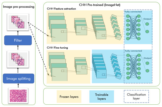 In this paper, we used transfer learning and fine-tuning approaches (see Figure 5). Transfer learning is characterized by using a trained model in one domain as a starting point for another domain’s training phase, reducing the amount of data required for achieving acceptable results, consequently reducing the processing time [47]. The trained model provides a structure that previously acquired knowledge and can be used to solve new problems, in contrast to the approaches of classical machine learning algorithms [48,49].