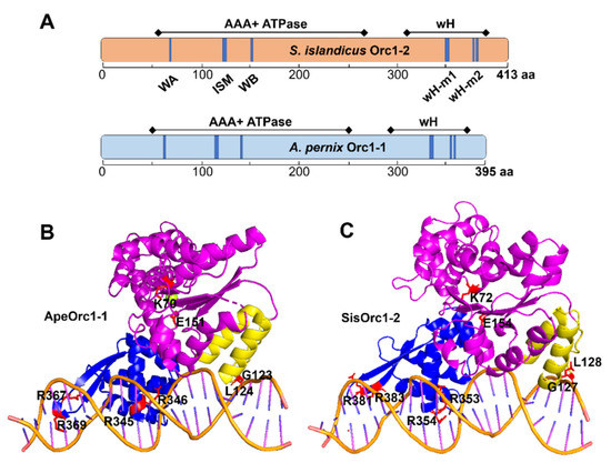 - Dueber, E.L.; Corn, J.E.; Bell, S.D.; Berger, J.M. Replication origin recognition and deformation by a heterodimeric archaeal Orc1 complex. Science (New York N. Y.) 2007, 317, 1210–1213. [Google Scholar] [CrossRef]