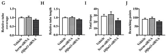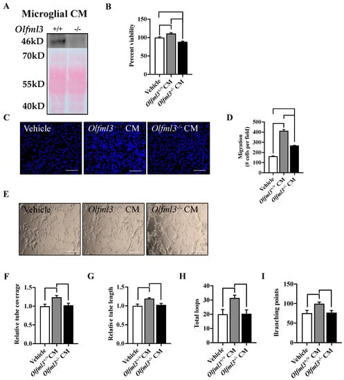 Relative tube coverage (Figure 3E,F), relative tube length (Figure 3E,G), total loops (Figure 3E,H), and branching points (Figure 3E,I) were all increased in Olfml3+/+ CM-treated ECs relative vehicle- and Olfml3−/− CM-treated ECs, respectively (p < 0.05). These findings suggest that microglia-derived OLFML3 is sufficient to promote all parameters of angiogenesis and may be necessary for EC viability and differentiation in juvenile C57Bl/6 brain microvascular ECs.