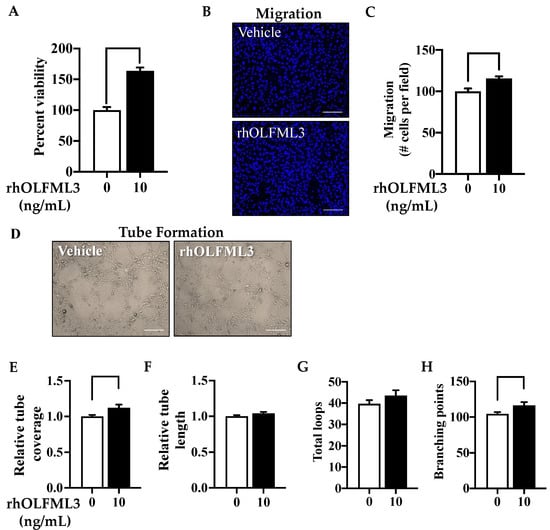 We next sought to determine the effect of exogenous OLFML3 on EC angiogenesis. To directly evaluate this, we treated primary mouse brain ECs with recombinant human OLFML3 (rhOLFML3; 10 ng/mL, 48 h). Exposure to rhOLFML3 nearly doubled EC viability relative to vehicle-treated ECs (p = 0.0001) (Figure 2A). Migration was also increased following rhOLFML3 treatment (p = 0.02) (Figure 2B,C). Moreover, multiple parameters of differentiation were increased by rhOLFML3 exposure. Relative tube coverage (p = 0.0346) (Figure 2E) and branching points (p = 0.0410) (Figure 2H) were both increased following exposure to rhOLFML3. Neither relative tube length (p = 0.1381) (Figure 2F), nor total loops (p = 0.2147) (Figure 2G) were altered by rhOLFML3 treatment. These findings support our hypothesis that OLFML3 is sufficient to promote angiogenesis in brain microvascular ECs.