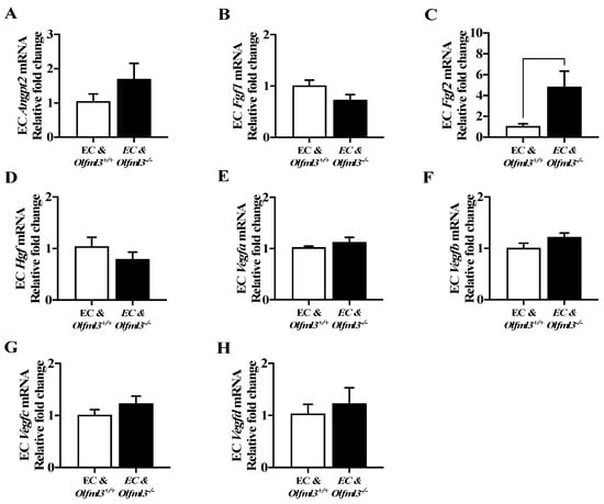 To determine whether Olfml3−/− microglia induced changes in EC gene expression, we evaluated the mRNA levels of pro-angiogenic molecules in ECs following co-culture with microglia. The loss of microglial Olfml3 induced an increase in EC Fgf2 expression (p = 0.0485; Figure 5C). All remaining genes assayed were not altered by the loss of microglial Olfml3 (Figure 5), suggesting that alterations to EC gene expression were not contributing to the reduction in angiogenic parameters observed following treatment with Olfml3−/− microglial CM.