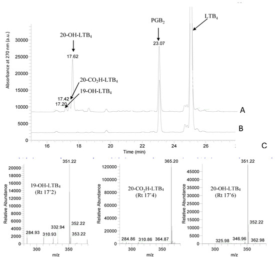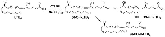- Shak, S.; Goldstein, I.M. Omega-Oxidation is the Major Pathway for the Catabolism of Leukotriene B4 in Human Polymorphonuclear Leukocytes. J. Biol. Chem. 1984, 259, 10181–10187. [Google Scholar] [CrossRef]