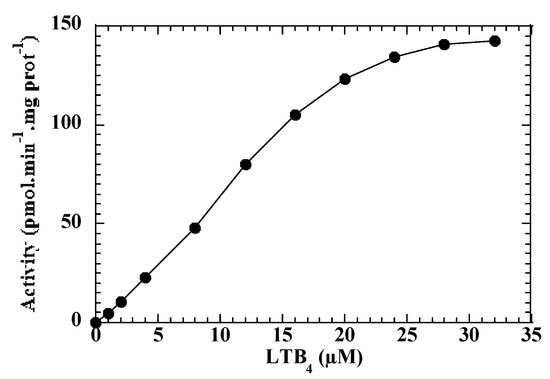 In the presence of 20 µM LTB4, the enzymatic activity, expressed as the sum of the three metabolites (19-OH-LTB4, 20-OH-LTB4 and 20-CO2H-LTB4) formed in 15 min at 28 °C, was dependent upon the microsomal proteins concentration and linearly varied in the 0 to 2 mg/mL range (data not shown). Kinetic experiments led to Km and Vm values of 12 ± 4 µM and 148 ± 25 pmol (total products)/min/mg protein, respectively (Figure 2). The affinity of LTB4 for CYP2U1 thus seems lower than that of AA (2.7 μM) [8] but higher than that observed for arachidonoylserotonin (82 µM) [9].